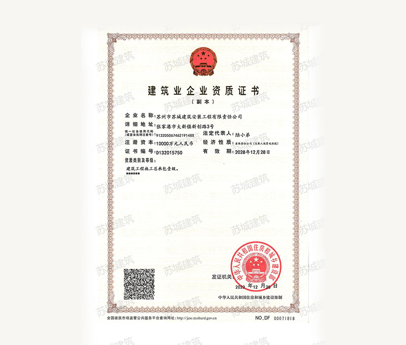 蘇州市蘇城建筑安裝工程有限責任公司,擁有主項建筑工程施工總承包一級資質,增項市政公用工程施工總承包二級資質和建筑裝修